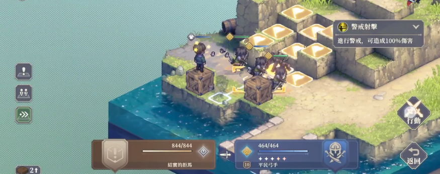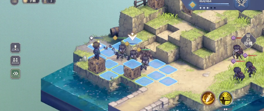 该关卡玩家主要是操纵三个弓手进行作战,其中包含有平民弓手与老练弓手两个兵种,平民弓手的身板较脆,建议不要让他落单,所以开局直接将其移动到两个老练弓手中间即可,这样可以最大程度分散敌人的火力。