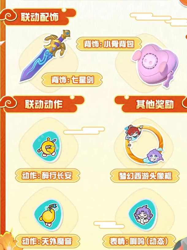 以及四款非常有特色的配饰【酒葫芦】【醍醐】【小骨背包】【七星剑】,还有两款联动动作可以获得,分别是【醉行长按】【天外魔音】,最后就是玩家们最喜欢的【嗷呜】动态表情包和【梦幻西游头像框】了!不过这个联动头像框的获取难度还是比较啊的,大家需要收集两款联动皮肤后才可以获得哦!