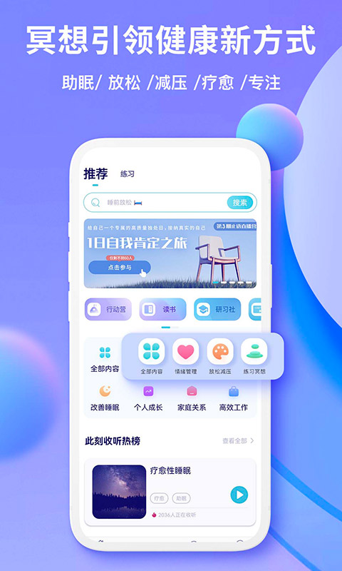 作为一款专注冥想放松的软件应用,冥想星球提供了丰富的冥想课程和引导语音。通过结合不同的场景和音乐,冥想星球可以帮助你快速进入深度放松状态,从而有效地缓解压力、改善睡眠、提高专注力。无论你是没有经验的初学者还是经验丰富的冥想者,都可以在这里找到适合自己的课程。