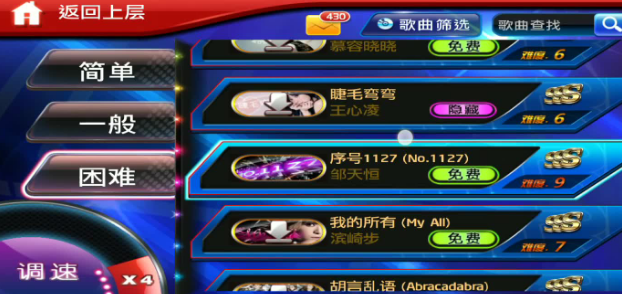 困难模式的级别还是相当高的,需要玩家拥有着操作技能以及相应的节奏感,总体的节奏也会较为复杂,需要玩家做出最准确的操作才能够得到分数。极难模式肯定难度是比较高的,因为曲目以及节奏都特别复杂,所以特别考验玩家的反应能力以及节奏性。在这种难度的级别当中,玩家们一定要进行反复的练习,这样才能提高精准度以及反应速度。