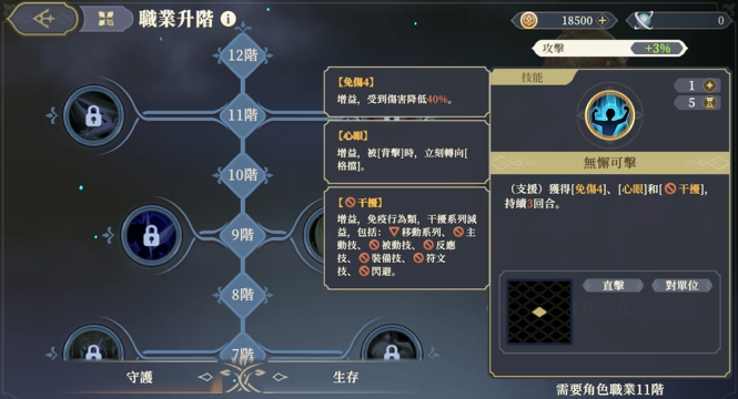 最后来看麦莎的十一阶技能选择:相较于能够击退敌人的麦莎连击,这名角色其实更需要能够提供免伤、心眼,以及免疫干扰等多重buff的“无懈可击”这个技能,它能够帮助麦莎更好地完成自己作为坦克位角色的使命。
