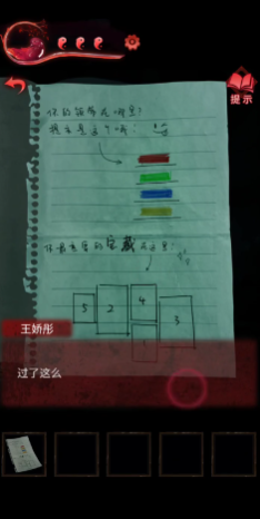 前面的剧情就不说了,直接从解谜讲起,女主能控制风扇吹走日历露出了钥匙,男主用钥匙打开抽屉获取玉簪,这时男主背起女友直接出门,但女友的灵魂无法出门,移动的范围只能在房间内。此时点击房间右边的书架,打开二层的书籍“谈招阴之物”,翻到书籍的最后一页就可以获得一张带有不同颜色纸张的线索,这张纸上有三个线索,分别对应了不同的游戏剧情。第一个要根据纸上的颜色去数书架每一层对应颜色的书籍数量。
