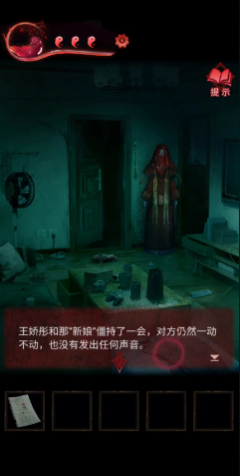 点击桌子上的化妆盒,用前面推出来的书籍数字“4235”打开箱子获得眉笔。回到大厅看到鬼新娘的手指向左下方,玩家就要点击砖块拾取招邪咒符,点击冰箱获得一把除冰铲,打开中间书房的门,发现NPC,用除冰铲铲掉门上方的图案,再把招邪咒符贴上去,借助眉笔将图纸改为“招福来、驱邪去”,这时纸媒婆就消失不见了。