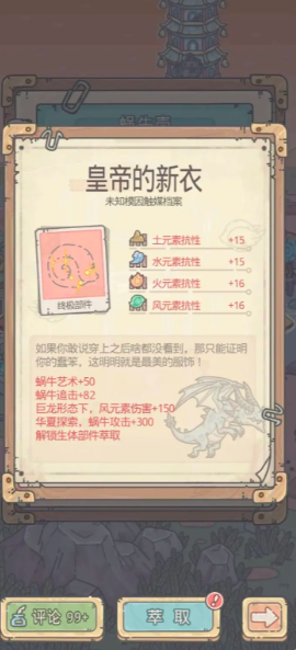 皇帝的新衣:可以增加土、水、火、凤四元素的抗性,穿上该蜗牛壳可 50点的蜗牛艺术、 82点的蜗牛追击,追击就是增强蜗牛的伤害实力哦。在巨龙的状态下可额外增加150点的风元素,玩家开启华夏探索玩法时蜗牛的攻击会增加300个点。