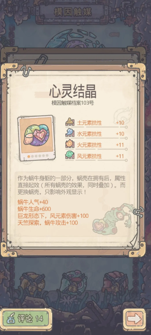 心灵结晶:虽然土、水、火、凤四元素抗住值增加的不是很多,但 40点蜗牛人气、 600蜗牛生命正是萌新玩家所需要的,只要蜗牛是巨龙形态,风元素的伤害直接增加100。每个蜗牛壳都会有相对应的探索玩法,主要是帮助蜗牛们快速的完成探索任务,而“心灵结晶”对应天竺探索,可得到 100点蜗牛攻击。
