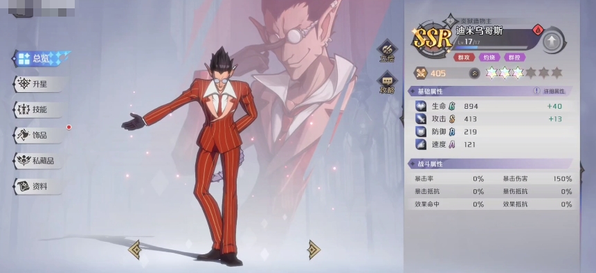 迪米乌哥斯:该角色的攻击达到了S级,速度也达到了A级,所以无论是先手爆发的能力和上限都非常可观,并且这个角色除了爆发以外,持续输出能力也是不错的,因为它的主动技能大多都可以为群体敌人施加灼烧效果。