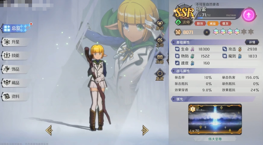 普攻则可以在打出单体伤害的同时一定几率对敌人施加效果抵抗降低,该效果持续两回合,对敌人算是一个比较具有威胁的减益手段,它和马雷的主动技还能形成一定联动,因为该技能是一个附带减速的单体法伤技能,有了效果抵抗的降低之后,敌人会更容易被减速。