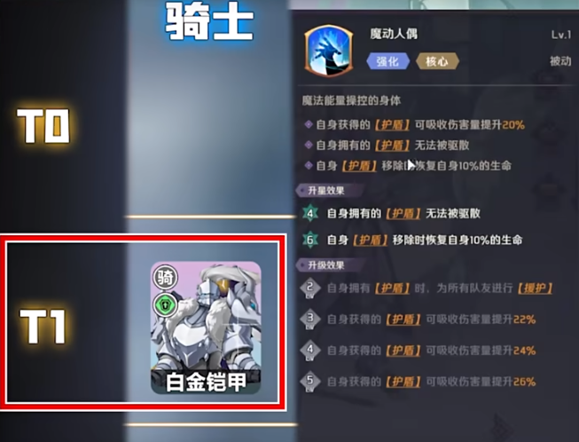 白金铠甲属于骑士,防御力较高,所使用的护盾可以吸收伤害,护盾一旦消失,还能回血,进行团队战时,护盾可以援护队友,只要敌人没有将护盾攻破,那么队友安全性就会得到提高。如果敌方有角色可以无视骑士防御,那么玩家需要做好其它的防御。