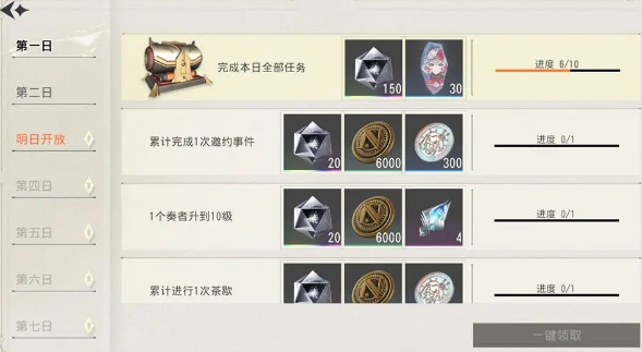 【红茶时间】也算是游戏中的一个签到福利任务了,不过这个任务只需要签到八天就可以免费获得ssr评分的乐装;同时大家在做这个任务的时候,还会获得一个友情点数,这些点数同样是可以在游戏商场中兑换【香气与记忆】的;