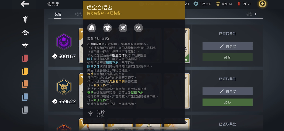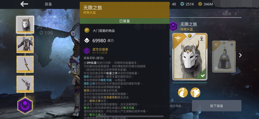 虚空合唱者套装的实力并不弱,基本满足大多数玩家在战场上的需求,该套装是由四个不同的装备组成的,分别是传奇头盔—无限之旅(69980战力)、传奇盔甲—七人委员会(91355战力)、传奇复合剑—法则之战(95084战力)、传奇爆能抢—因迪格,拥有两个不同武器的套装不多,该套装占一件。