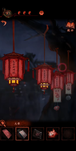 第二个灯笼要挂老虎布偶,请柬后是有生肖线索和三个符号的,灯架上点燃的五个灯笼就要借助生肖线索,成功可获取老虎布偶。这时树下的纸人手中有锣棒,玩家们要记得拿,是敲锣节奏的重要道具。