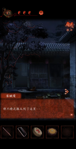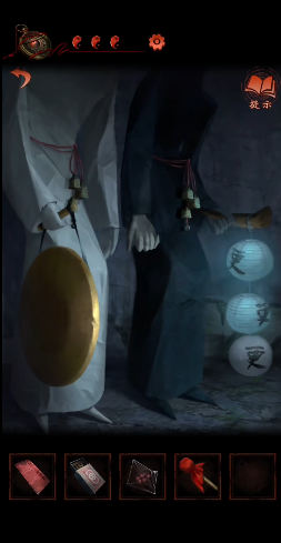 黑白棋子要放在古董收藏室架子的盒子上就可获得罗盘,在走廊处旋转罗盘,指针与红点方向一致时,和红线在一排的文字就是解谜线索,得到的答案就是风水室的密码,玩家遇到的纸人用打火机烧掉,在西洋收藏室里有一个道具“万花筒”,要仔细观察“万花筒”的六种图案,这是获得下一关的线索,摔断的戒指要用胶水粘上。