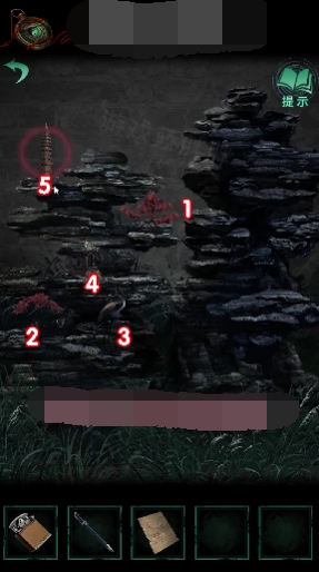 玩家用打火机点燃大门左右两边的灯笼,按照“左左右、左右左、右右右”的顺序扣门进入庭院,点击左边假山,按照下面图片的数字顺序点动机关获得一个三叉戟。水里的电话要用三叉戟拾,但突然出现一只手将电话拽了进去,拨号盘外壳会遗留在地面上。接下来回到门外面,点开左边的石狮子,将拨号盘外壳放上去,从左到右依次调整为壬、丙、丁、乙、甲即可获得一把钥匙,顺便取下拨号盘外壳。