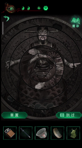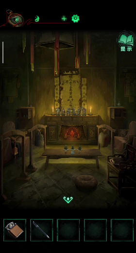用获取的钥匙打开前方的房门,将图案拼成一个完整的人形,随后向右移动看报纸上有四个不同颜色的偏旁部首,右边机关的中间文字从上到下依次为鬼、卜、歹、心。点击庭院外面的右下角的石狮子,放上拨号盘外壳后依次输入物、千、万、生、土可得到另一把钥匙,回到庭院用钥匙打开前方的大门。接下来点开左边的柜子,调整成福寿图的样子,玩家这时可领取羊头和猪头的雕像。此时再点开右边柜子,按照五行相克的规则解谜,摆放成功即可获得铃铛,