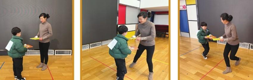3.宣布游戏开始后,幼儿与妈妈分别用硬面书捧着纸球的同时努力去看对方的数字,并尽力不让对方看到自己的数字。最终,球不掉并成功看到对方数字者获胜。