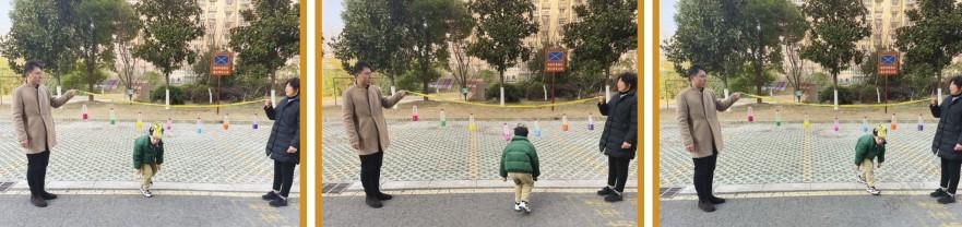 4.家长慢慢逐一将木棍滚落下来,孩子跳跃躲避木棍。