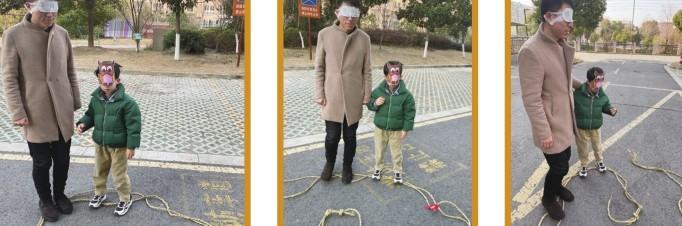 3.宣布游戏开始后,家长和幼儿在手工编织绳上,依靠脚触觉行走。