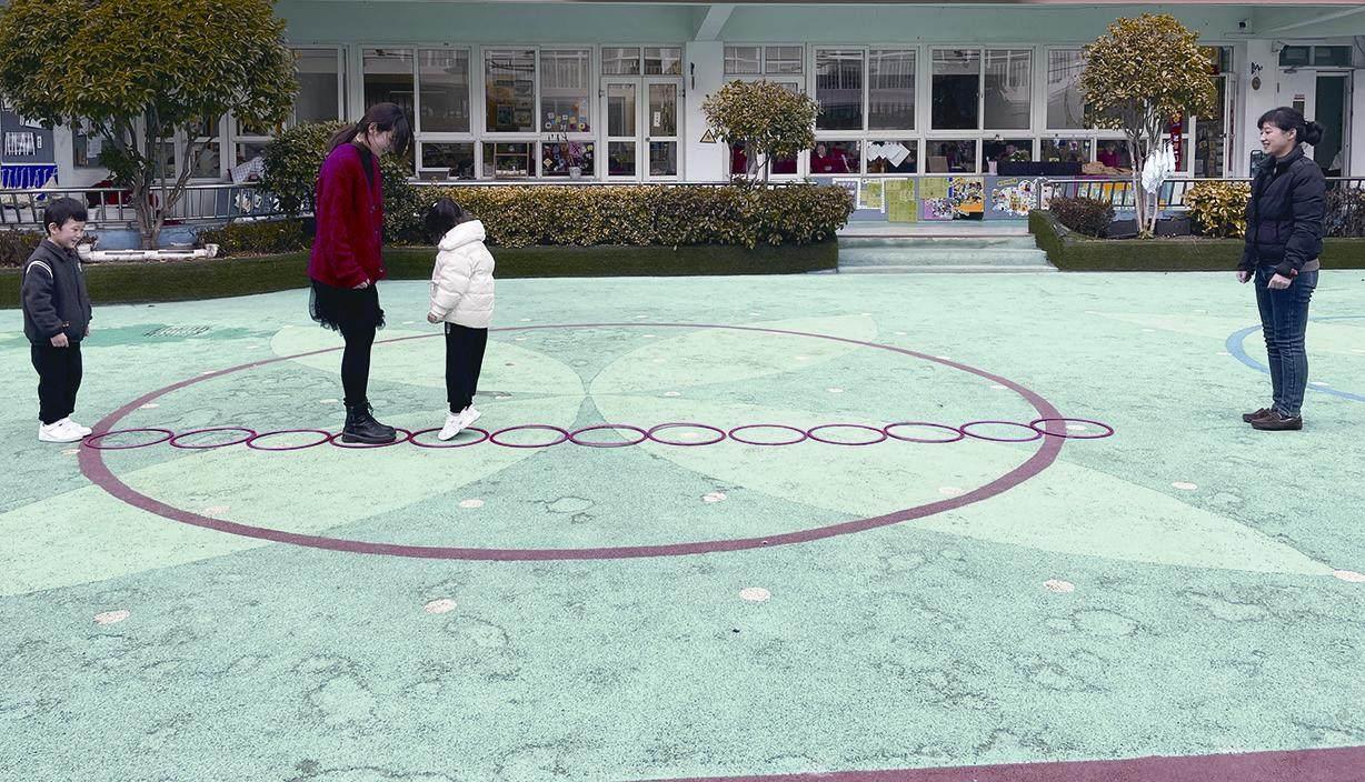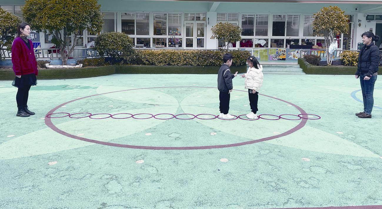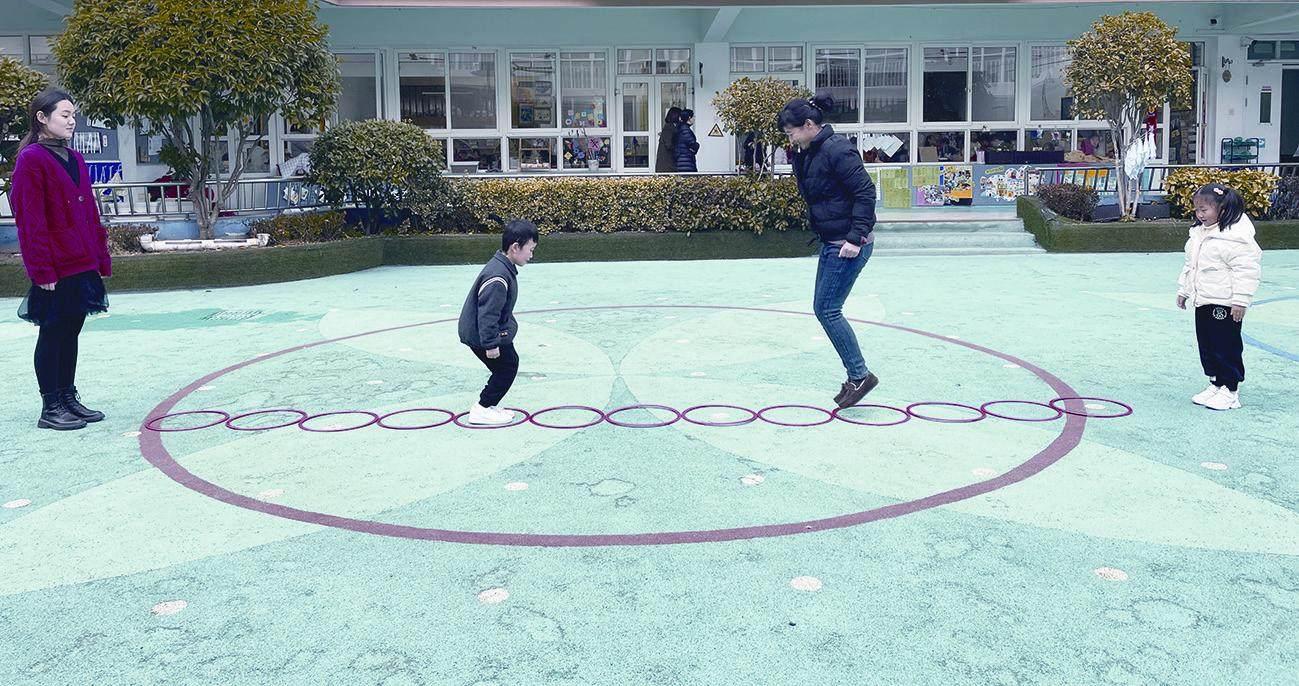 1.幼儿和家长分成两队,从各自起点同时跳圈前进。