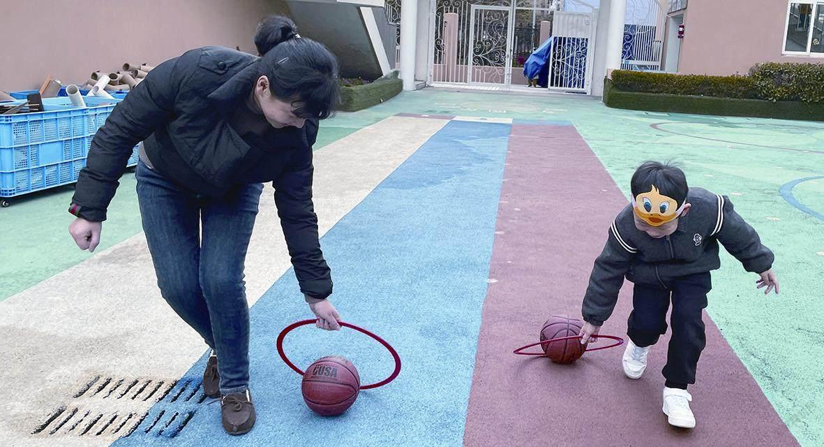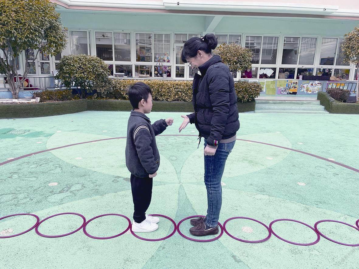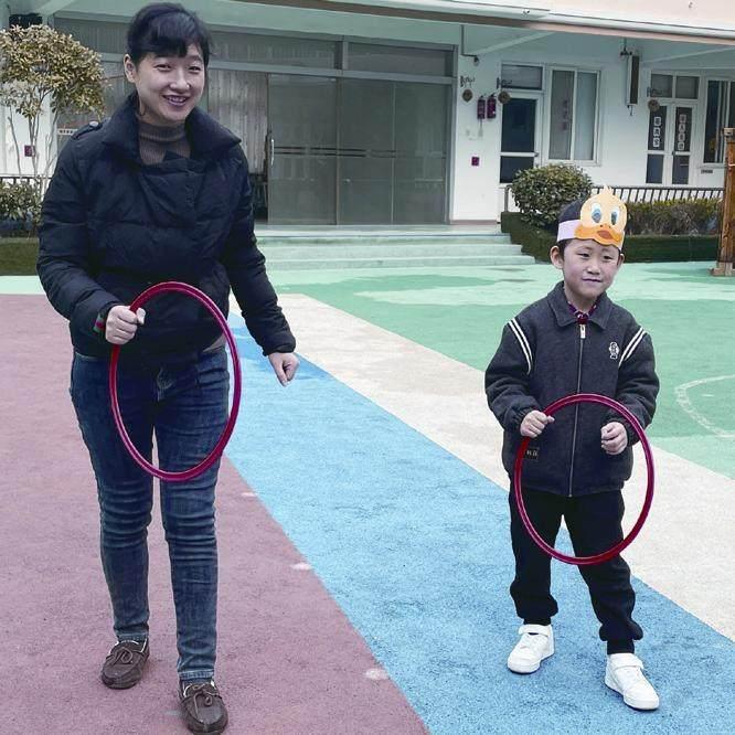 1.将绳子系在套圈上,家长拉住绳子,使套圈在椅背后上下移动。