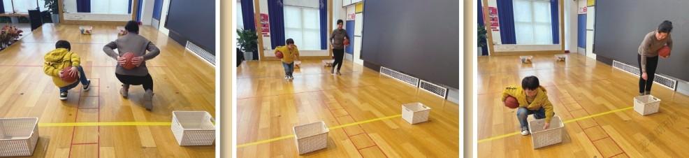 3.用鸭子步往前行走,到达终点后拿一块积木带着球,迅速跑回,把积木放入筐内。