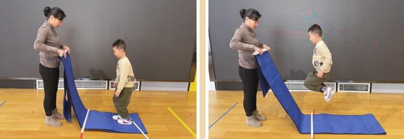2.孩子接替家长来摆放软垫,家长蹦跳。
