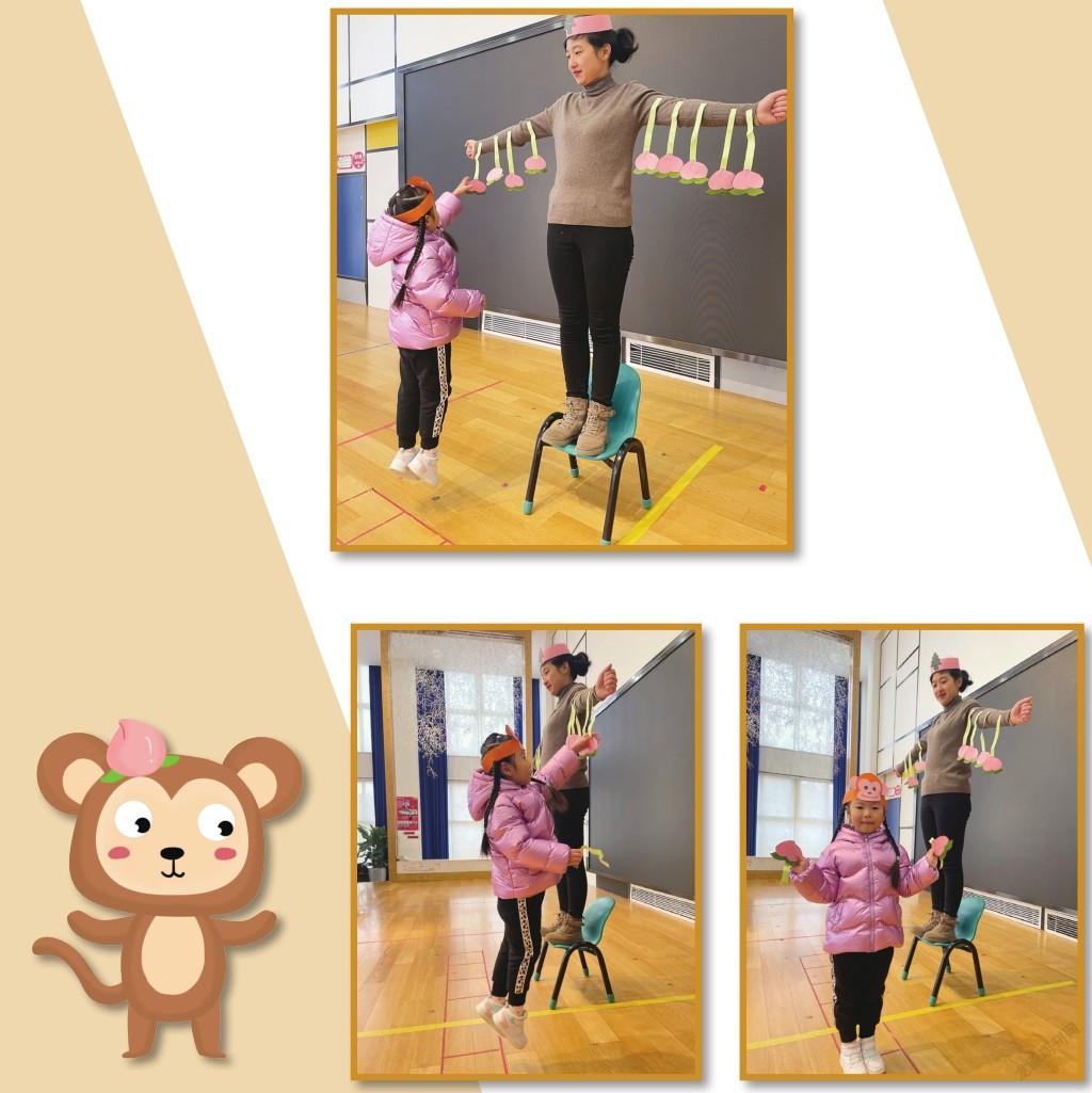 1.家长将桃子图片贴在手臂上,站立在椅子上,张开双臂。