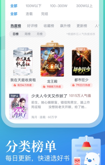 在中会看到每日优选,为大家定制私人书单。其中有南希喜欢看的大热门小说,比如《牧神记》、《斗破苍穹》、《万古神帝》等高热度小说,这些都被改编成动漫了。而且平台中还有特色的男女频道,大家可以看到各种题材的排行榜。