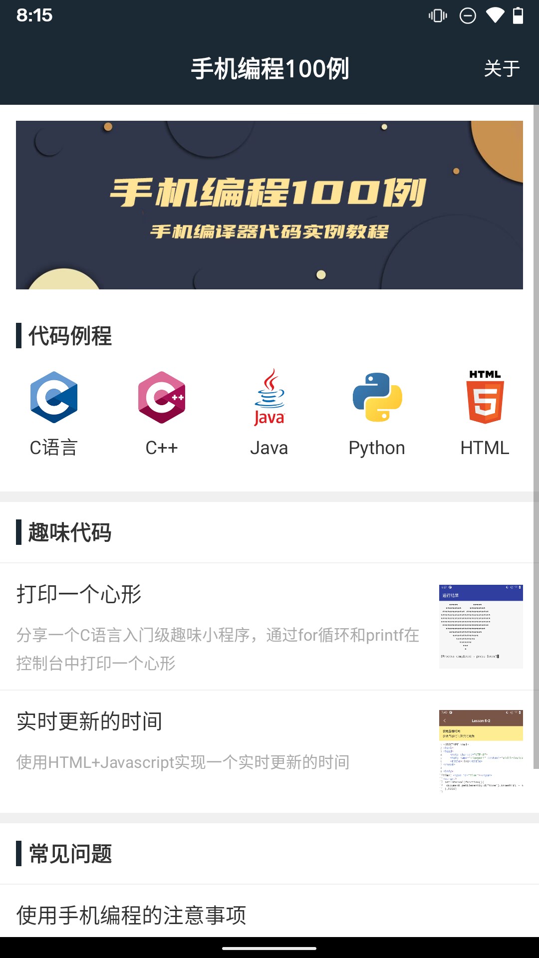 手机编程100例这款软件是一款能够让我们学习到主流的编程软件的编程实例子,在这个软件上,大家能够通过不同软件的调节来找到比较经典的编程代码,可以让我们实现针对性的学习。同时软件中还有一些比较具有趣味性内容的编程代码。