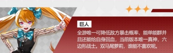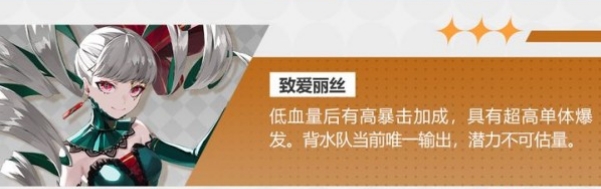 致爱丽丝:这个角色有一定的缺点,确实在血量数值上面不算高,但是大家也可以通过上面的高爆发带来输出,有暴击的加成这个角色的输出是可以短暂提升一个阶段的,需要大家培养一段时间,使用效果会更好一点。