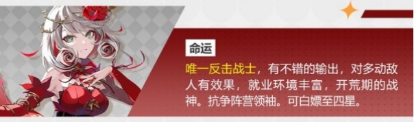 命运:是前期大家可以获取的高品质角色,在输出效果很强的时候基本都是新手阵容中的阵眼,但是其实大家也可以利用这个角色的反击效果带来更多的伤害,目前在游戏中有高反击的也只有这个一个角色,所以很多的阵容都是适合搭配命运的。