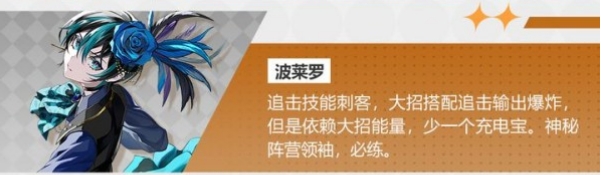 波莱罗:这个角色其实是带来追击效果的,而且在行动上面非常的迅捷,如果按照职业来分辨的话,她绝对是一个刺客类的职业,在游戏中也是可以带来输出效果的,不过因为大招的输出最多,所以需要打击储存一定的能量才可以带来攻击的效果。