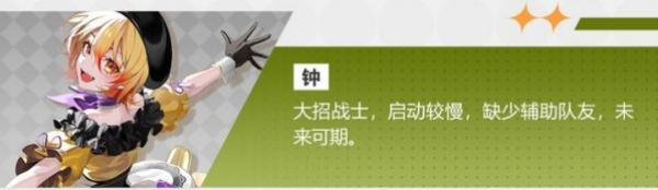 钟:这个角色大家也不要小看,因为在自己本身的属性上面看起来缺陷比较大,所以部分玩家不喜欢,但是只要是在队伍里面有辅助,立马就可以起飞,不过也一样需要大家前期进行培养,属于一个有潜力的角色。