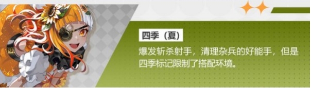 四季:这个角色的基础攻击一般,但是只要爆发就可以带来超高的输出,在上面群攻技能是可以群杀小兵的,而且也可以使用标记的技能来改变周围的环境,有爆发的时候就算是射手在场也是可以直接击杀的哦。