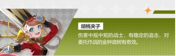 胡桃夹子:属于是一个战士类的角色,虽然有追击的效果,但是其实是比较有针对性的,如果大家蛮对的是金钟诡树,那么就一定要用这个角色,这个角色的强度完全是针对某一些作战的。