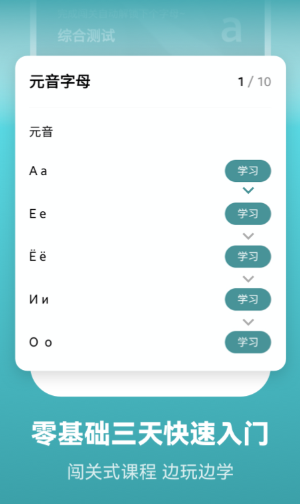 从元音和字母部分开始带领我们入门俄语学习之中,会提供海量由浅入深的权威专业课程供大家一键获取。软件还带有众多的测试可以挑战,每天坚持不懈就会有显著的提升。
