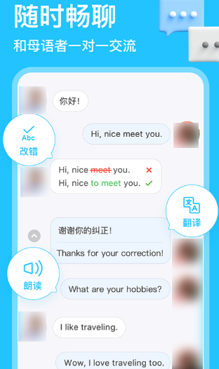 汇聚了全球各个语种的用户在其中互相帮助、自由学习。软件主要是通过让不同语言小伙伴一起聊天的形式来互相进行语言能力的提升,我们可以帮助对方进行语法、单词纠错,更是可以一键翻译,从而达到无障碍沟通的目的。
