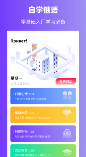 零基础学习俄语的一款神器,软件会自动根据我们目前的测试水平来推荐每天的学习课程和题目练习项目,更是带有单词记忆关卡可以挑战。