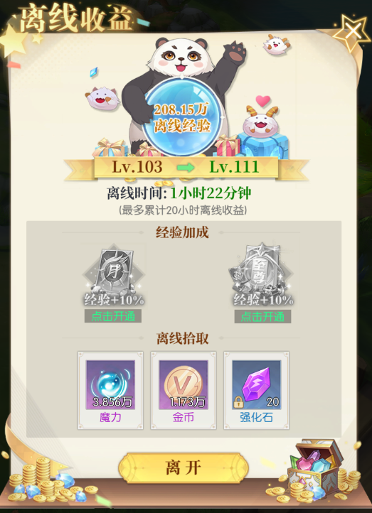 1,第一个办法就是离线收益了,大家在游戏商城中可以购买一些经验书,一次可以使用两本书,可以给大家离线经验增加20%,还是比较划算的,同时离线的时候不仅是可以获得游戏中的金币的,还可以获得强化石和一些魔力!