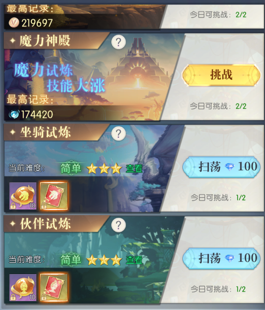 同时在这个副本玩法中,还有两个【坐骑试炼】【伙伴试炼】,这两个副本是游戏中的额外副本,也就是与主角关联不大,但是获取的经验也是比较丰富的,大家可以按照小编说的顺序来进行挑战,这两个副本是可以进行扫荡的,也是大大的减少了玩家们升级所花费的时间,大家使用扫荡功能的时候,需要花费100个钻石哦!