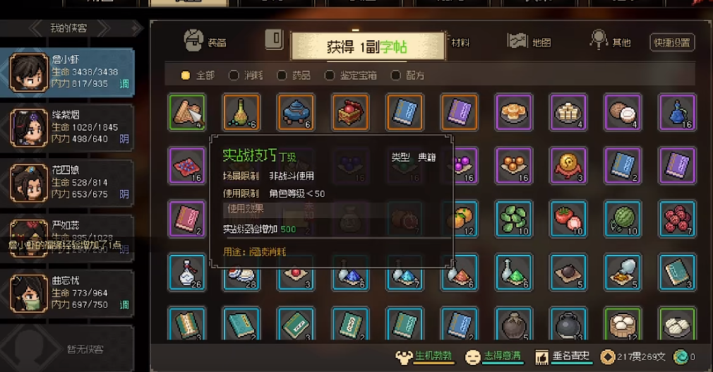 首先我们需要知道机关术的经验值是如何获得的。机关术的经验值主要有两种途径,一是通过和打更人交流,达到生死之交的关系,每次可以获得100点机关经验,二是通过给一些特定的NPC送礼物刷到生死之交的关系,每次可以获得1800点机关经验。其中,送礼物的对象有两个,一个是九江水寨的诸葛神机,另一个是儒圣馆的残棋。这两个NPC都喜欢收到仁德类的书籍,比如书院里卖的绿色小说和 1仁德之类的绿书。