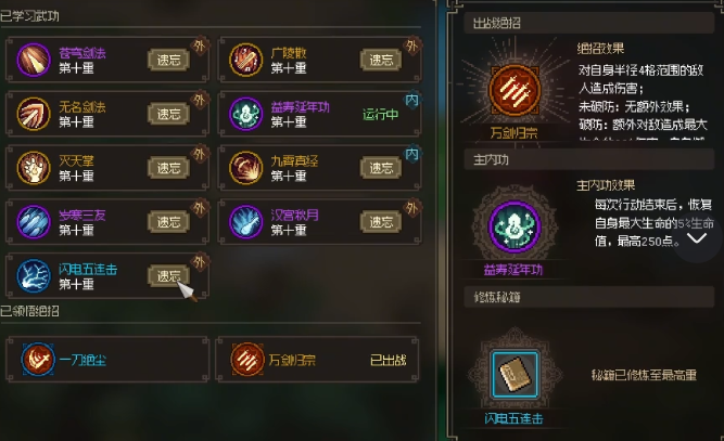 接下来玩家将会跟卫兵进行激烈的战斗,由于士兵的实力不俗,所以千万不要轻敌,只要把卫兵击败之后就会拥有一个选项,在此一定要慎重选择,千万不要乱选,可以选择放虎归山,也可以选择将其击杀。如果选择的是放虎归山,玩家就可以获得一本武林秘籍,这本武林秘籍非常罕见,属于甲级秘籍,名字叫做鬼轮斩,特别值得大家获取。