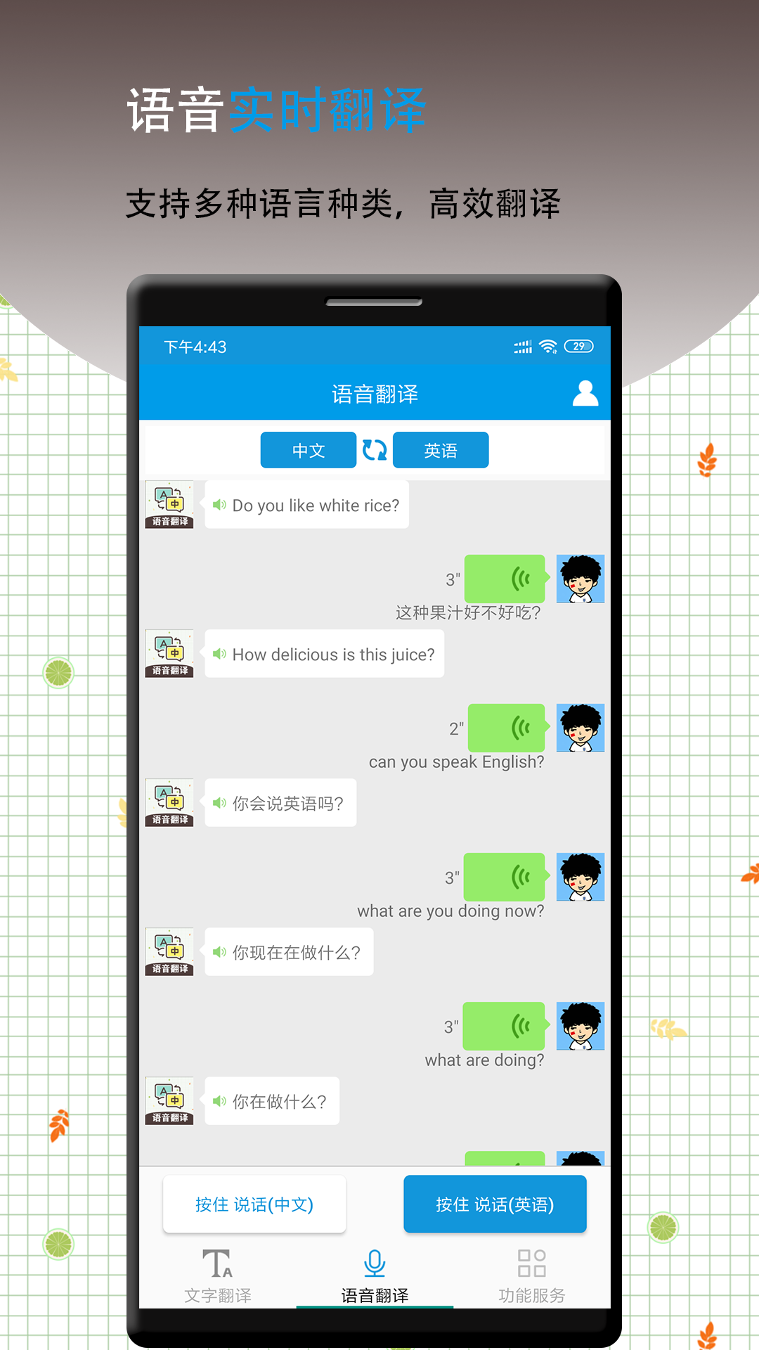 英语翻译软件王这款软件是一款能够实现中英互译的App软件,在这款软件上我们能够借助软件实现听说的快速切换,并且如果我们实现语音转换的话,我们也能直接复制粘贴转换好的文字,并进行转发使用起来也是十分的便携。同时在立刻软件上,大家还能选择一些比较专业的英语课堂课程,这些课程都是由专业的真人一对一辅导,可以有效地解决我们语言障碍上的问题。