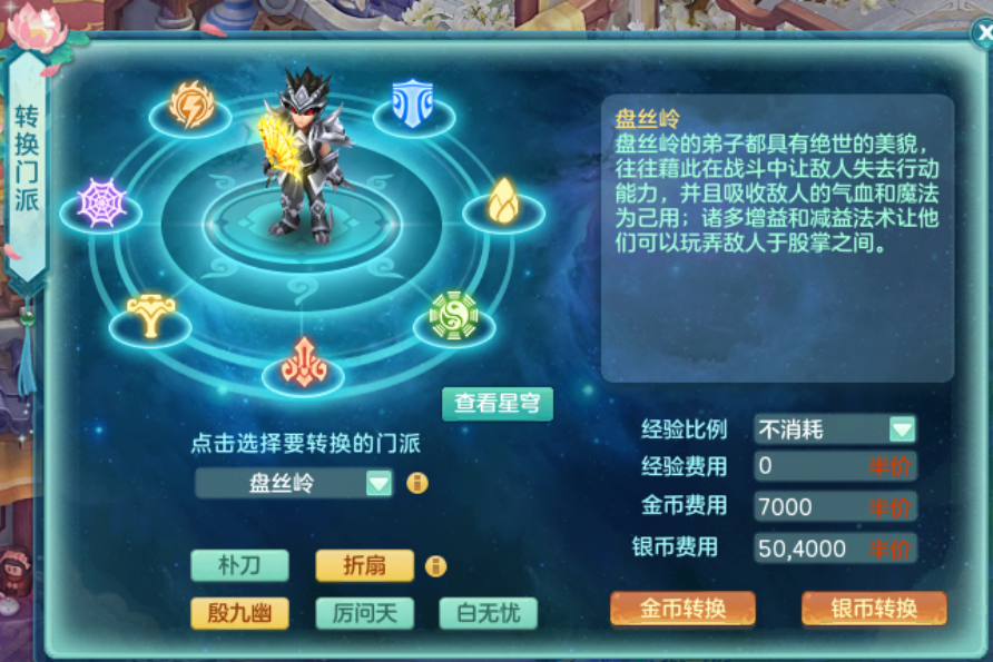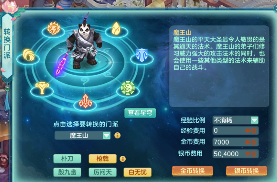 但如果你是新手玩家,那么你可以选择操作简单,练级快速,装备便宜的门派,如无名谷、龙宫、天宫等、如果你是老手玩家,那么你可以选择操作复杂,练级慢速,装备昂贵的门派,如魔王山、方寸山、地府等。土豪玩家不用选了,直接上喜欢的即可。