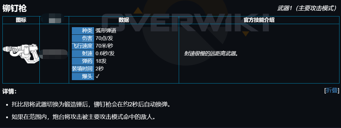 部署炮台:托比昂的核心技能,可以掷出一座自动炮台,接触水平表面后3秒内部署完毕,自动攻击视野内的敌人,每秒造成56点伤害。炮台有250点生命值,可以通过锻造锤修理,也可以通过互动键手动摧毁。炮台被摧毁后有10秒的冷却时间,未被摧毁则为5秒。炮台的位置选择很重要,要考虑到视野、防护和隐蔽性等因素。