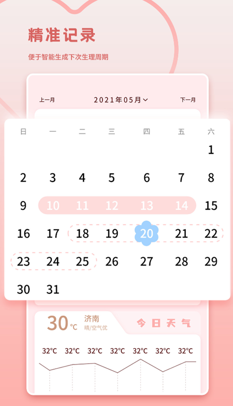 一次简单的设置就会就可以拥有长期有效的陪伴,点开就可以帮你快速的查看经期的各种信息,提前预知自己的身体情况,个性化的设计让你操作起来更加的方便。