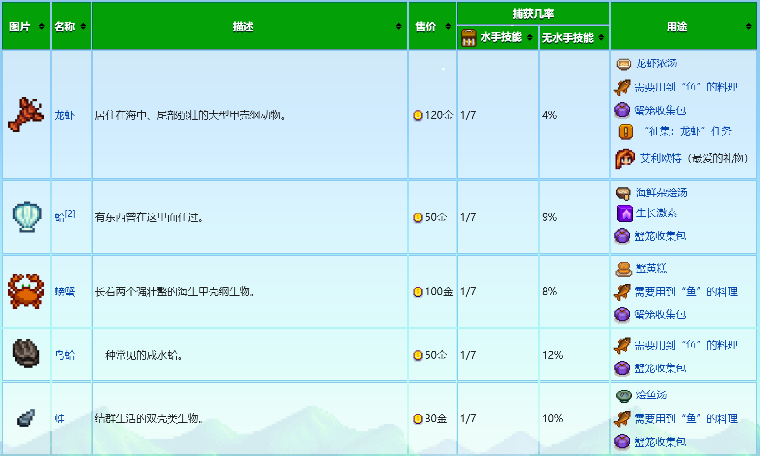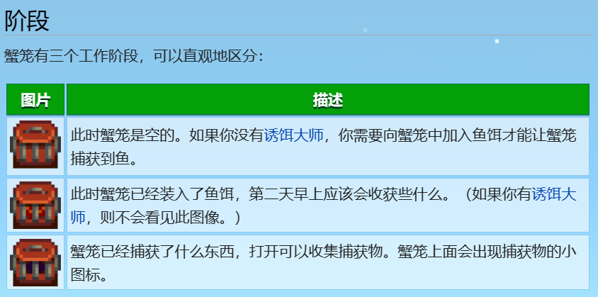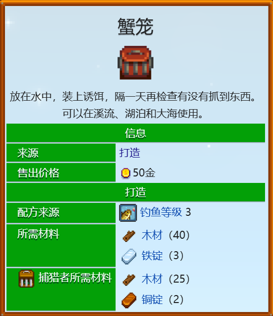 蟹笼是一种可以放置在水中的工具,可以用来捕捉龙虾、螃蟹、蛤、蜗牛等水产。蟹笼的制作需要达到钓鱼等级3,然后用40个木头和3个铁锭打造。如果选择了捕猎者这一职业,那么制作蟹笼只需要25个木头和2个铜锭。蟹笼也可以在鱼店以1,500金的价格购买。