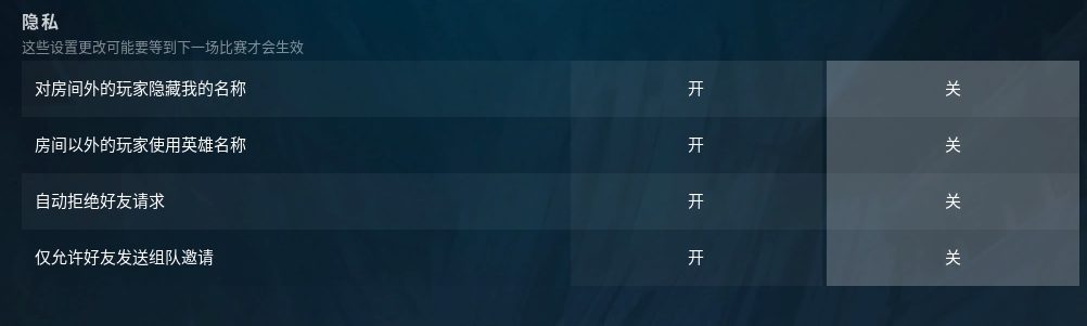当然,如果只是一些不怎么熟的好友也可以不用开启这个隐藏名称,直接把自动拒绝好友请求打开也是一样的,这样你后续无论是开启对局还是单纯挂着都可以不受他们的影响,至于隐私栏目中其他的两项,则主要是针对陌生人的设置,它们也是有一定用处的,有需要也都可以去尝试!