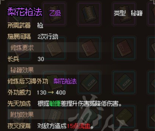 如果你一直培养杨幺儿,在他学到了十种的梨花枪法之后,我们还可以触发剧情,然后让他领悟到终极绝招,乙-梨花奥义,是不是光听名字就知道是一招非常强的技能呢?!而且这位角色还有很多的剧情和互动是玩家可以玩到的,如果可以的话还是把他拉进队伍里面好点,会让你的游戏体验变得更有趣。