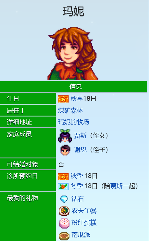 玛尼是星露谷中的一位牧场主,她住在南部的玛尼的牧场,经营着她的农场。她是一个温柔善良的女性,喜欢动物和自然。她的生日是秋季18日,如果在这一天送给她喜欢的礼物,可以获得更多的友情值。