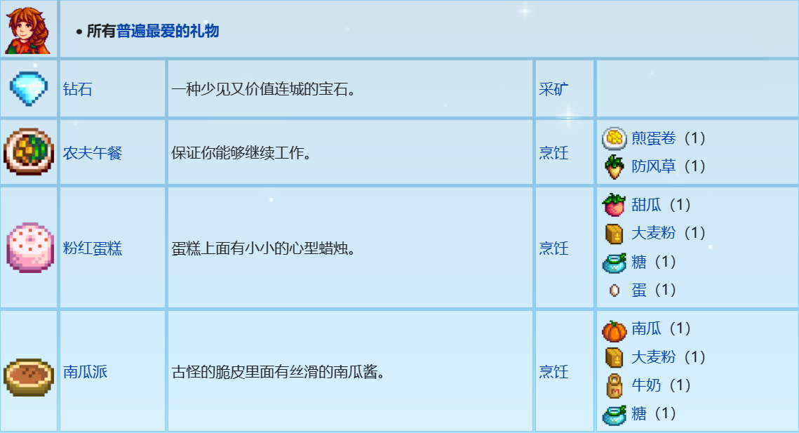 玛尼的最爱礼物有四种,分别是农夫午餐、粉色蛋糕、南瓜馅饼和钻石。这些礼物都可以在商店购买,或者自己制作。农夫午餐是一种食物,需要用鸡蛋、牛奶和面粉制作。粉色蛋糕是一种甜点,需要用小麦粉、糖、鸡蛋和甜菜制作。南瓜馅饼需要用南瓜、小麦粉、糖和牛奶制作。钻石是一种宝石,可以在矿洞中开采,或者用结晶器制作。